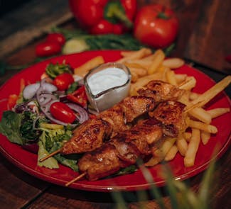 Ten soczysty smażony filet z dorsza podawany jest z frytkami, sałatką wegetariańską oraz lekkim sosem koperkowym.