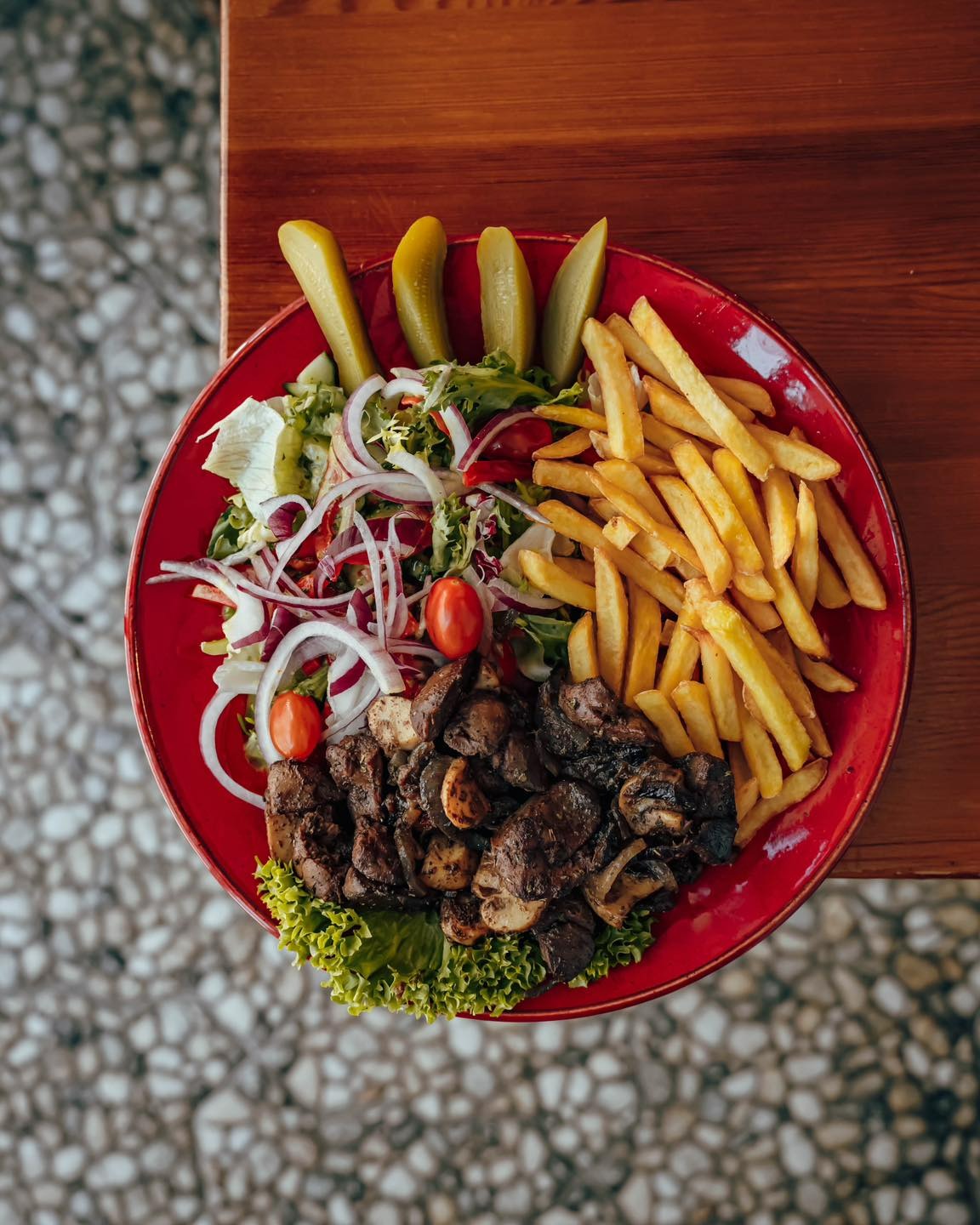 Ten soczysty smażony filet z dorsza podawany jest z frytkami, sałatką wegetariańską oraz lekkim sosem koperkowym.